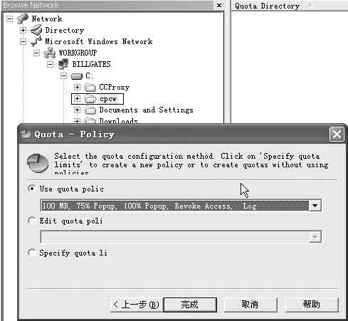 SpaceGuard SRM为果冻对文件夹进行限制提供了大量的配额策略,这样就免去了手工设置的麻烦。如果冻要限制“CPCW”共享文件夹使用100MB磁盘空间,当容量使用达到75%时发出警告,达到100%时禁止任何用户对该文件夹进行添加文件的操作。选择“Use quota policy”选项,并在下拉列表框中选择“100 MB, 75% Popup, 100% Popup, Revoke Access, Log”选项,最后点击“完成”按钮,这样“CPCW”共享文件夹就被限制为只能使用100MB磁盘空间了。