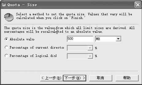 在“Quota - Policy”对话框中,选择“Specify quota policy”选项,点击“下一步”按钮,在“Absolute value”栏(图3)中输入允许“CPCW”文件夹使用的磁盘容量(如500MB)。接着点击“下一步”按钮,进入“Quota - Limits”对话框,在对话框中为该配额策略设置限制操作,如“CPCW”共享文件夹使用到限制容量的90%时,弹出警告对话框,当达到100%时,禁止所有用户使用。