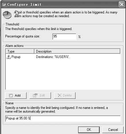 双击“Name”栏中的“Popup at 75.00 %”项目,弹出“Configure Limit”对话框 (图4),在“Percentage of Quota size”栏中输入“95”,点击“OK”按钮,点击“下一步”后,在“Quota-Save policy”对话框中的“policy”栏中输入“1000 MB, 95% Popup, 100% Popup, Revoke Access, Log”,为修改后的配额策略取个名,最后点击“完成”按钮即可完成内置配额策略的修改。