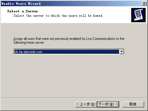 要让用户能够通过Live Communication Server进行通讯,我们必须在AD中启用相应用户的这项功能。打开“Active Directory Users and Computers”,右键单击想开启即时通讯功能的用户,单击“所有任务”,并选择“Enable users for live communications..”。系统将会启动“Enable Users Wizard”,单击“下一步”。选择一个主服务器,如图14,如果你的网络中只有一台Live Communication Server,那么选项中将只包含这一项,完成后单击“下一步”。在操作结果步骤中,单击“下一步”(注意:如果用户在AD中没有填写email地址,那么操作将不会成功,应为Windows Messenger是用email作为用户帐号来登陆的),如果操作都成功,单击“完成”。