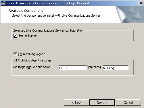 确认所安装的组件是“Home Server”。如果需要将即时消息信息存储到中央数据库,请选择“IM Archiving Agent”并指定消息队列路径名,如图5。单击“下一步”继续。