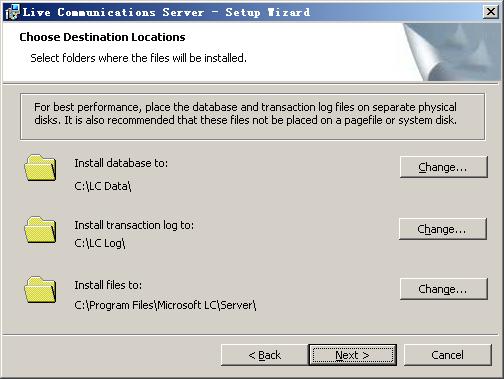 选择安装路径,包括数据库路径、事务日志路径和程序文件。可以通过单击每一项右侧的“Change…”按钮来更改默认路径。(如图7)单击“下一步”继续。