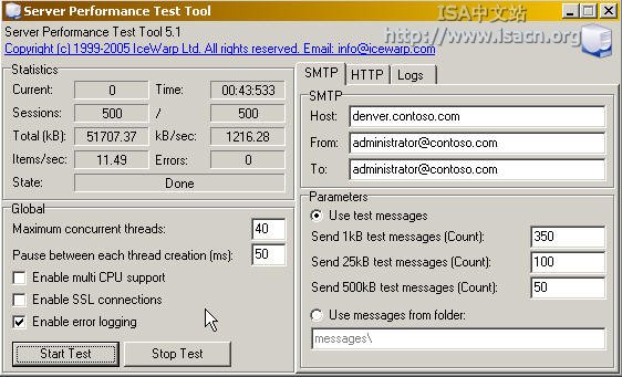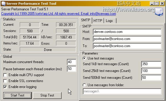 最近为了选择ISA中文站所使用的邮件服务器,特对Windows下的邮件服务器性能进行了评测,注意,只是性能测试。为什么不包含功能测试呢?因为Serverwatch.com已经作了,Serverwatch.com对于每个邮件服务器有自己的评价,但是是根据功能来进行评价,对于性能方面是没有评价的,我只是相当于对它的评价做一次补充,完整的体现邮件服务器的特性而已。