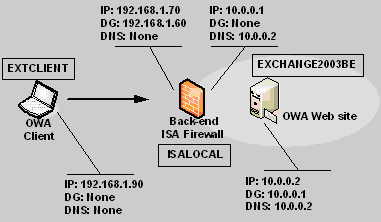 OWA客户计算机必须能够通过OWA Web服务器证书中的名字来解析OWA服务器的名字。这个Web服务器的名字在此例中是owa.msfirewall.org。OWA客户必须能够解析这个名字到ISA防火墙进行侦听的外部接口,在此例中是192.168.1.70;