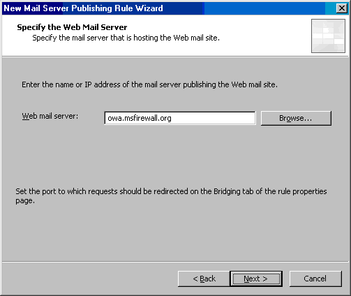- 在Specify the Web Mail Server页,在Web mail server 文本框,输入内部OWA Web站点的域名。在此我们使用owa.msfirewall.org,注意这个名字必须和证书的名字一样。