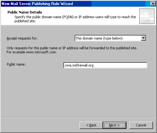 name (type below)。在Public name文本框中输入外部用户用于访问OWA站点的名字。在此例中,外部用户将使用owa.msfirewall.org。再次声明,这个名字必须和证书的名字一致,并且外部用户通过外部的DNS解析到ISA Server的外部接口上。点击 Next;