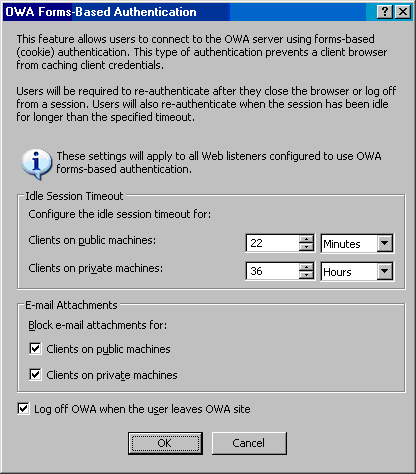 - 在OWA Forms-Based Authentication 对话框,勾选Clients on public machines, Clients on private machines 和 Log off OWA when the user leaves OWA site ,这些设置为你的OWA站点增强了安全性。注意你也可以为在公共计算机和私有计算机的客户设置超时时间。注意,让用户来决定连接的安全级别是错误的,你应该为所有的用户强制使用相同的策略,点击OK。