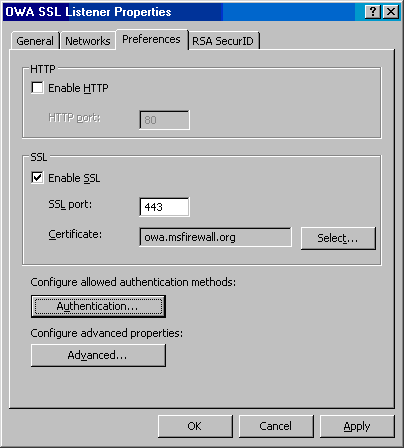 - 在OWA SSL Listener Properties对话框,点击Preferences标签,点击Authentication按钮;