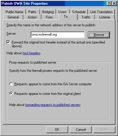 - 在OWA Web site Properties对话框,点击To标签。在To标签,选择Requests appear to come from the original client 。这个选项允许OWA Web站点接受外部客户的实际IP信息。这个特性允许OWA站点上的Web日志插件记录地址信息。这个To标签非常重要,因为Server文本框的名字必须和证书的名字一致。我鼓励你在端到端使用相同的名字,虽然它不是绝对的。