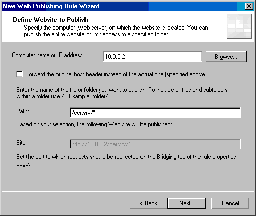 - 在Define Website to Publish 页,在Computer name or IP address栏输入内部CA的IP地址,在此例中,IP地址是10.0.0.2,在Path文本框,输入/certsrv/*,点击Next;
