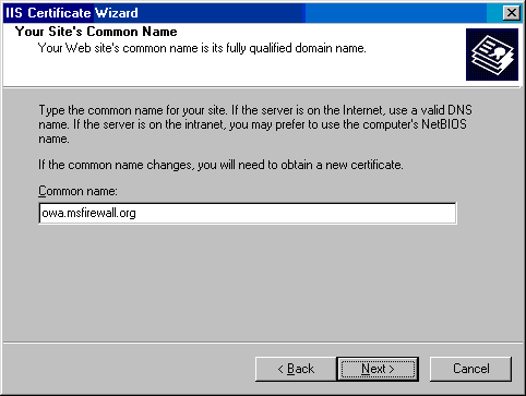 在Your Site's Common Name页,输入站点的公共名字,这个公共名字将被内部和外部的用户用来访问这个站点。例如,如果用户使用https://owa.msfirewall.org来访问这个OWA站点,那么站点的公共名字就是owa.msfirewall.org。在此例中,我们输入owa.msfirewall.org。这是一个很重要的设置,如果你没有输入正确的公共名字,在连接OWA站点时会出现错误。点击Next;