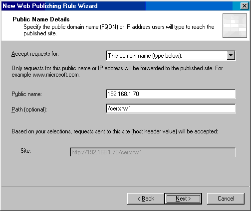 - 在 Public Name Details 页,在Accept request for列表选择This domain name (type below)。在Public name文本框,输入ISA防火墙的外部接口的IP地址,在此例中是192.168.1.70,在Path (optional) 文本框中输入/certsrv/* ,点击Next;