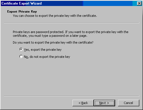 - 在Export Private Key页,选择Yes, export the private key,然后点击Next;