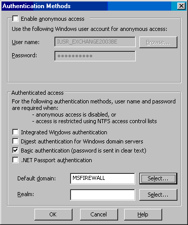 - 在Authentication Methods对话框,取消勾选除了Basic authentication (password is sent in clear text) 的所有选择框,勾选Basic authentication。在提示你应该使用SSL来保护密码的对话框中点击Yes。在Default domain文本框中输入你的域名,在此例中为MSFIREWALL,点击OK。