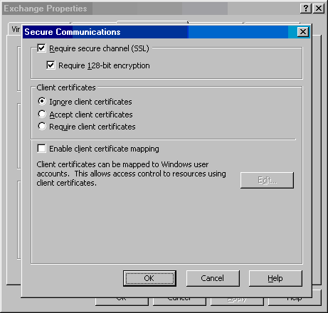 - 在Exchange Properties对话框中点击Directory Security ,然后在Secure Communications框架中点击Edit;
