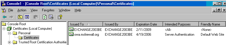 - 此时,你可以在右面板看见导入的证书。证书的颁发机构必须放置在Trusted Root Certification Authorities\Certificates存储区,这样ISA防火墙计算机才能信任这个计算机证书。