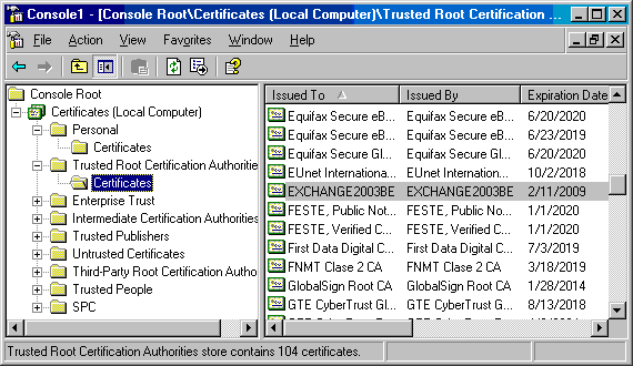 - 展开左面板的Trusted Root Certification Authorities,向下滚动,注意,企业证书颁发机构已经自动的添加进来了,因为我们使用的是企业CA,并且ISA防火墙属于和企业CA相同的域。如果你使用独立CA,或者ISA防火墙不属于和企业CA相同的域,那么,你需要复制这个证书到Trusted Root Certification Authorities\Certificates 节点。这可以通过右击CA证书,然后点击Copy命令,然后点击\Trusted Root Certification Authorities\Certificates 节点,然后再点击MMC菜单栏的Paste按钮。