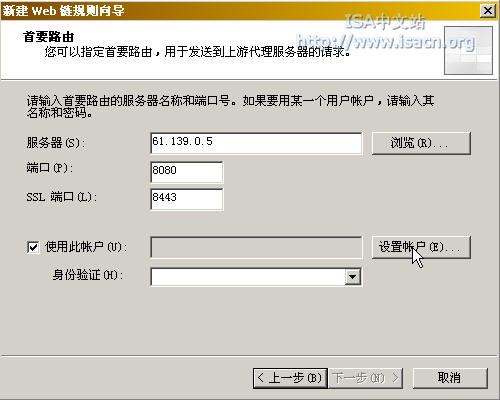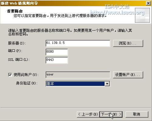 在上游服务器需要身份验证的情况下,它会要求下游代理传递身份验证信息,因此,必须配置ISA Server传递身份验证信息。在Web链中ISA Server只支持基本身份验证和集成的Windows身份验证,不过用户名和密码最多只能为7位字符,否则下游代理服务器将不能通过集成的Windows身份验证;但是如果使用基本身份验证,身份验证信息将以纯文本形式进行传输,所以建议你在与上游服务器通讯时使用SSL进行加密传输。