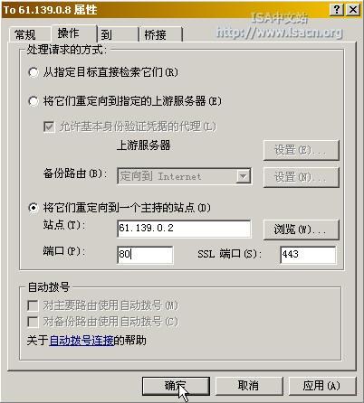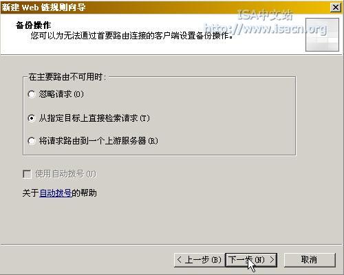 将客户的访问请求路由到特定的上游服务器。在这种情况下,你可以指定主路由和备份路由。当主路由不可用时,ISA 服务器使用备份路由。ISA 服务器计算机定期轮询指定作为主路由的上游服务器,以确定其是否可用。主路由一旦可用,就会使用主路由,而不再使用备份路由。