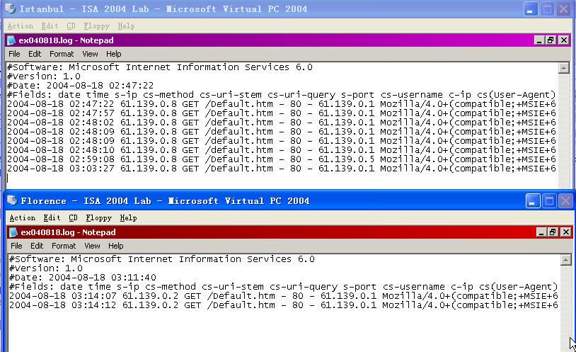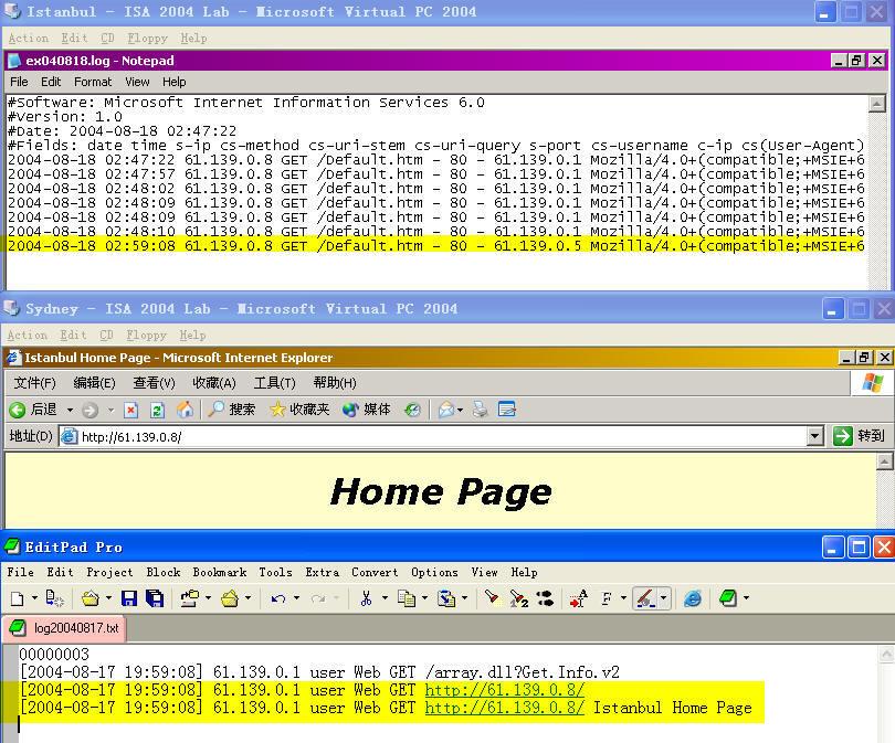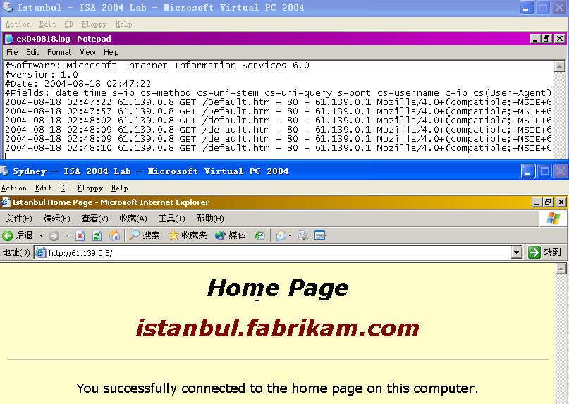 我们已经在Sydney(ISA 2004防火墙,IP为61.139.0.1)上建立好了一条访问规则:允许本地主机访问所有网络的HTTP协议。在Sydney上打开一个浏览器窗口,访问Istanbul上的Web站点,访问成功,页面及Web服务器上的日志如下图所示,上半部为Istanbul(61.139.0.8)上的Web日志,下半部为Sydney(61.139.0.1)上的浏览器窗口。