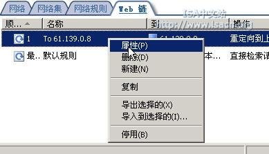 现在我们来修改Web链规则,将访问Istanbul的请求重定向到Florence(61.139.0.2),在ISA管理控制台中,右击Web链规则 To 61.139.0.8,选择属性;