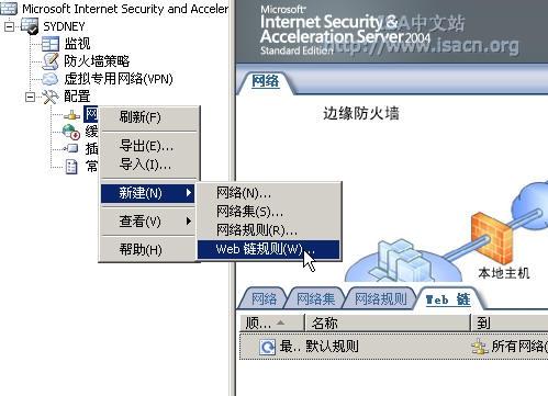 在Sydney上打开ISA Server管理控制台,右击配置下的网络,点击新建,选择Web链规则;