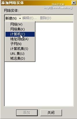 在弹出的添加网络实体对话框,点击新建,再选择计算机;因为我只是针对61.139.0.8这个IP,所以才选择新建计算机,如果你是针对域名集、URL集或地址范围,则根据你的需要进行选择;