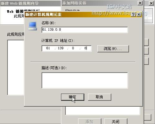在弹出的新建计算机规则元素对话框,输入名称和IP地址为61.139.0.8,点击确定;