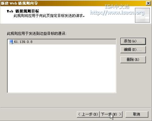 双击计算机目录下的61.139.0.8,然后点击关闭,在Web链规则目标页,点击下一步;
