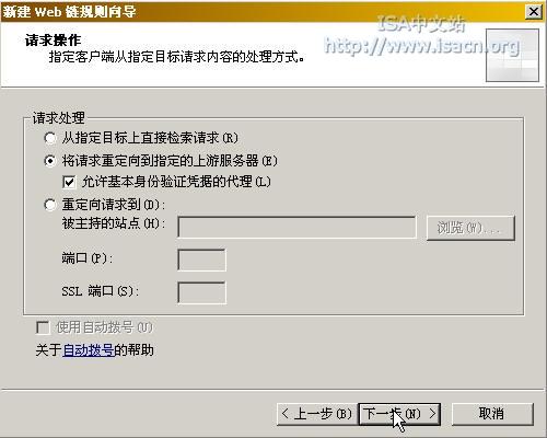 在请求操作页,选择将请求重定向到指定的上游服务器,由于Proxy上的HTTP代理程序不支持Windows集成身份验证,所以我勾选允许基本身份验证凭据的代理,点击下一步;