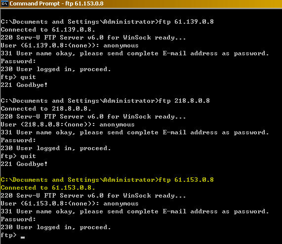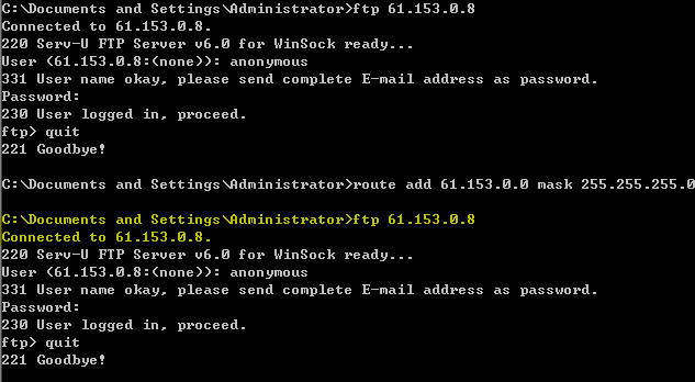和上面的路由表相比,只是多了一个通向61.153.0.0/24子网的路由,现在我们再ftp 61.153.0.8试试,