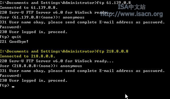 首先在ISA防火墙运行ftp 61.139.0.8,使用匿名用户登录,