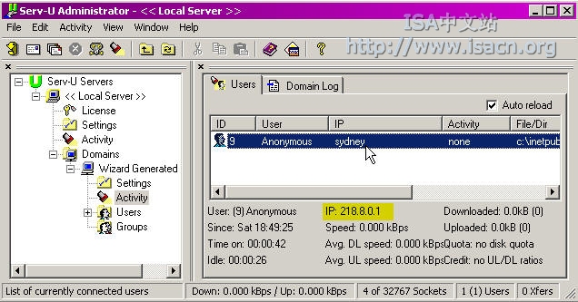 FTP管理控制台上显示的客户端IP地址为218.8.0.1,和上面的道理是一样的,ISA防火墙使用和目的IP同个子网的接口218.8.0.8来进行访问,