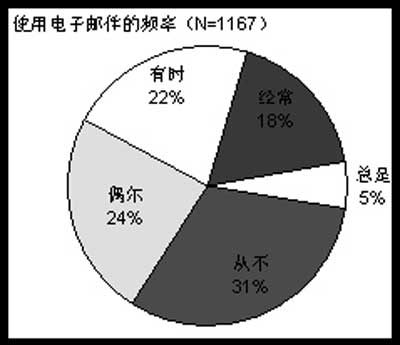 通讯:1/3网民从不使用电子邮箱在通讯工具的调查中,有31%的网民从不使用电子邮件,经常和总是使用电子邮件的网民分别占到了18%和5%,而有时和偶尔使用的人则占了网民的将近二分之一。OICQ等即时交流工具具有实时对话的特点,虽然也有三分之一强的网民并不使用它,但对于使用者来说,有将近三分之一的网民频繁地使用OICQ,这部分网民通常有一上网就打开OICQ聊天工具的习惯。