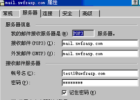 下面可以在内部使用test1@swfzasp.com来收发信件了。如果用OUTLOOK收发,在设置帐号时必须把POP3和SMTP服务器都设置为mail.swfzasp.com,用户名设置为test1@swfzasp.com,如下图,
