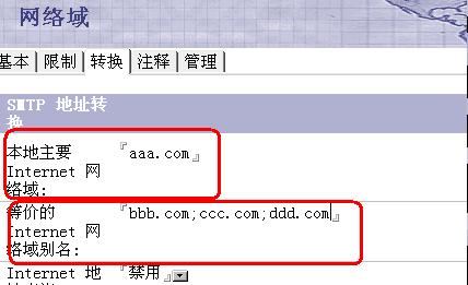 注意: 3。在“转换”页中,“本地主要Interent网络域”应该是公司的主要的Interent网络域的名字,而“等价的Interent网络域别名”是公司的其它的Interent网络域的名字。