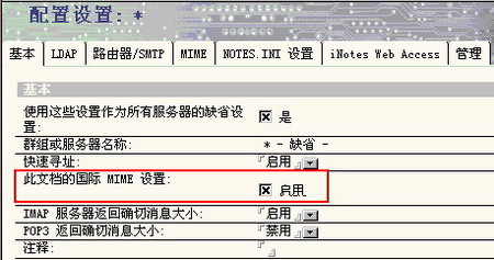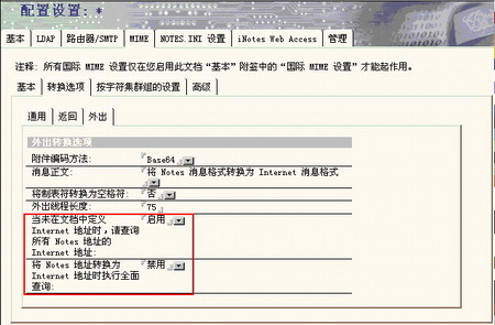 5. 点击“MIME”标签,在“转换选项”-“外出”子标签下,将“当未在文档中定义Internet地址时,请查询所有Notes地址的Internet地址”设为“启用”