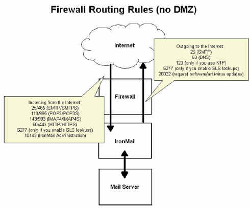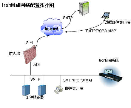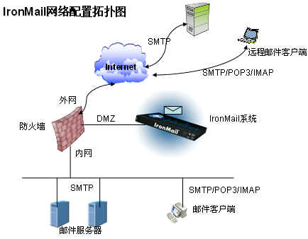 下面给出了IronMail在防火墙DMZ区的网络配置图: