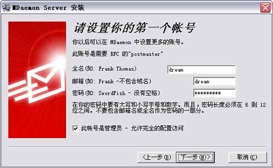 稍后,安装向导还需要你设置邮件服务器中的第一个账号,依照窗口中的提示设置邮件账号(图1)。接下来只要依照安装向导并使用默认设置完成安装即可。