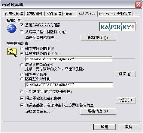 选择“启用AntiVirus扫描”项,为了安全起见,在“病毒扫描动作”中选择“删除整个邮件”,然后单击“确定”按钮即可。这样,当邮件服务器接收到带病毒的邮件,该邮件就会直接被删除了。