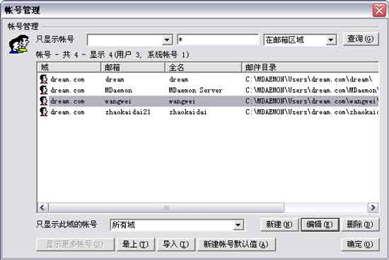 接下来,就可以给公司的每位员工配置一个邮箱了。在邮件服务器主窗口中单击菜单“账号→账号管理”,打开账号管理窗口(图3)。