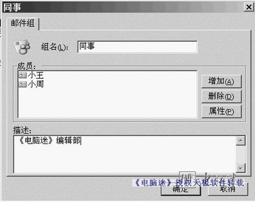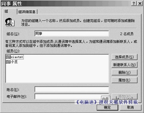 3.在“组名”栏中输入“组”的名称,如“同事”;在“姓名”和“电子邮件”文本框里输入组员名和邮件地址,点“添加”按钮或回车即可。重复操作可添加多个组员。完成后点“确定”退出,“同事”组就建立好了。