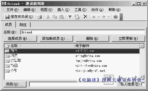 小知识:“组”功能实际上就是将多个联系人的电子邮件地址“捆绑”在一起,当向这个“组”发送邮件时,系统就自动向“组”中的所有成员同时发送邮件,省去了一个个发送邮件的麻烦。