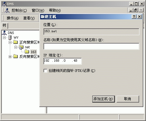 2、为域名“163.net”建立相关的DNS记录。选“正向搜索区域→右键→新建→区域”,输入“net”;选“net→右键→新建→域”,输入“163”;选“163→右键→新建→主机”,“名称”一栏保持为空,“IP地址”一栏输入“192.168.0.48”;最后选“添加主机”,遇有提示,一律选默认值。如下图: