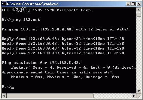 3、测试DNS记录是否建立成功。选“开始→运行”,输入“cmd”,再确定,即可打开一个MS-DOS窗口,输入“ping 163.net”,如果有如下图的响应,即说明已成功建立好了DNS记录!