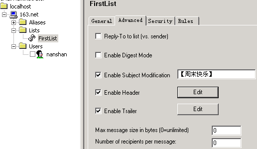 ⑴如选中“Enbale Subject Modification”,再在后面输入相应内容,则向此邮件列表发出的所有信件当转发到列表中各用户时,邮件标题栏最前方均会自动加上所输入的内容。