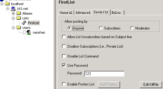 ⑹如选中“Use Password”,并在“Password”中输入相应的口令,则只有知道此口令的用户才能向此列表发邮件。