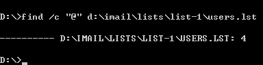 4、如果想知道一个邮件列表(比如“List-1”)中包含的所有E-mail数,则在MS-DOS方式下用如下图的格式来查看。其中,“find”为DOS的一个内部命令,它的功能是查找文件内容,“List-1”为要查的邮件列表名,“Users.lst!”为存订户的列表文件名,前跟其所在的路径。——实际上此命令的作用是查看列表文件中有多少个“@”符号!由于一个E-mail有且仅有一个此符号,所以“@”的个数即为列表中“Address”的数量。如下图所示: