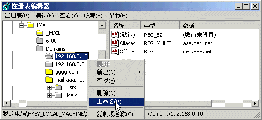 3、例如,本机原来的IP地址为“192.168.0.10”,在IMail中的其对应的邮件主机名为“mail.aaa.net”,别名为“aaa.net”,现在本机的IP地址改成了“192.168.0.1”。