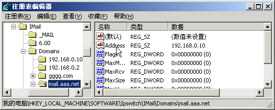 2、找到IMail的域名存让地。选“HKEY_LOCAL_MACHINE→Software→Ipswitch→IMail→Domains”。